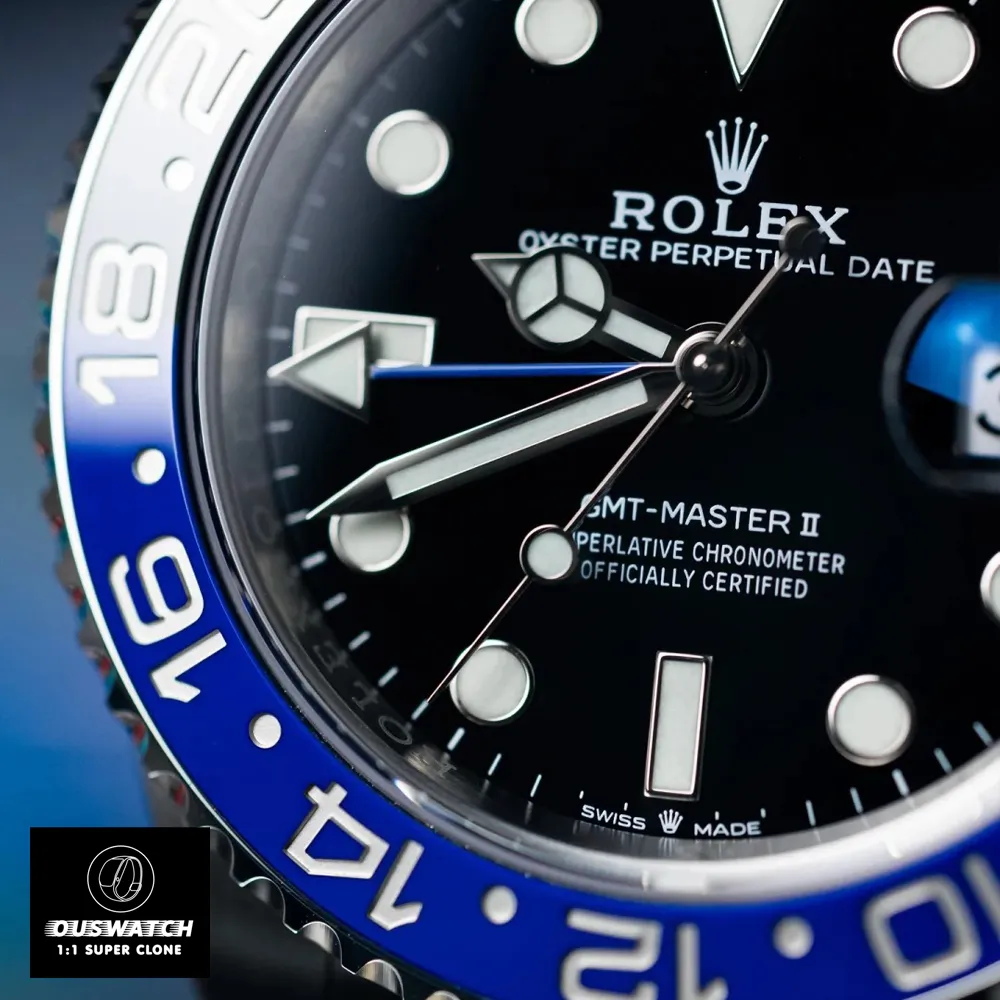 The Best gmt watch Rolex 126710BLNR Super Clone is a premium 1:1 replica of the iconic Rolex GMT-Master II “Batman.” This Super Clone watch captures all the hallmarks of the original – from its 40mm Oystersteel case to the signature black-and-blue ceramic bezel insert – while offering an affordable GMT watch alternative to the genuine model. Crafted in corrosion-resistant 904L stainless steel (Rolex’s proprietary Oystersteel), the case and bracelet are built to last and look virtually indistinguishable from the original. Even on the wrist, the bold blue-and-black bezel and matte black dial give this clone the unmistakable “Batman” personality without the luxury price tag. The date magnifier (Cyclops) and luminous Chromalight markers ensure readability just like the authentic Rolex, making this replica a great men’s Batman watch with real-world functionality