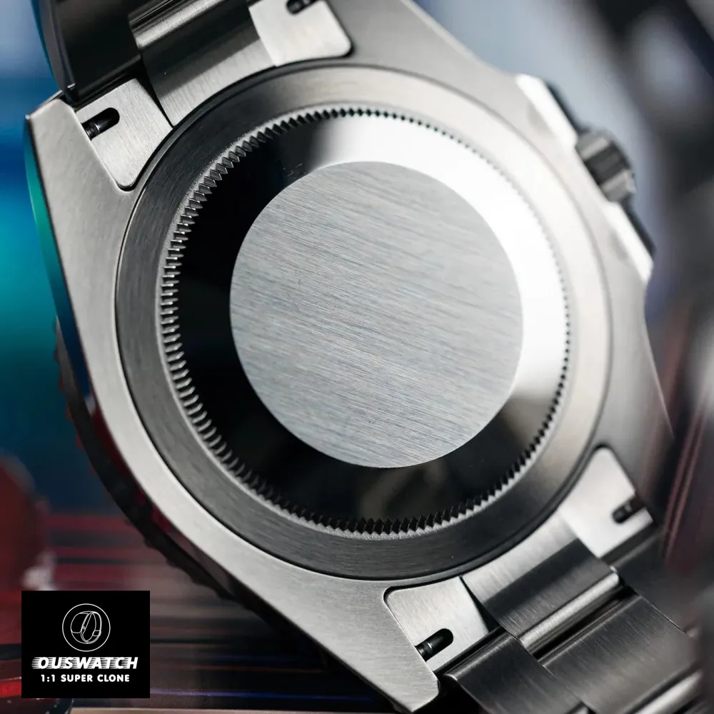 The 40mm Oyster case of this Super Clone mimics Rolex’s original Oyster Perpetual GMT-Master II design. It is machined from solid 904L steel for exceptional corrosion resistance and a superior polished finish. The screw-down winding crown (with Triplock seals) and solid screw-down caseback ensure the clone is waterproof up to 100 meters, just like the genuine Rolex. Around the crystal sits a bidirectional 24-hour bezel, fitted with a two-colour blue and black Cerachrom ceramic insert. This insert – half deep midnight blue and half jet black – gives rise to the “Batman” nickname. The Cerachrom bezel is highly scratch-resistant, and its engraved numerals and indices are filled with platinum for added legibility and durability. The bezel clicks precisely with a satisfying feel, allowing you to track a second timezone easily. All these elements – case shape, finish, and bezel colors – are faithfully replicated to match the Rolex GMT-Master II original.