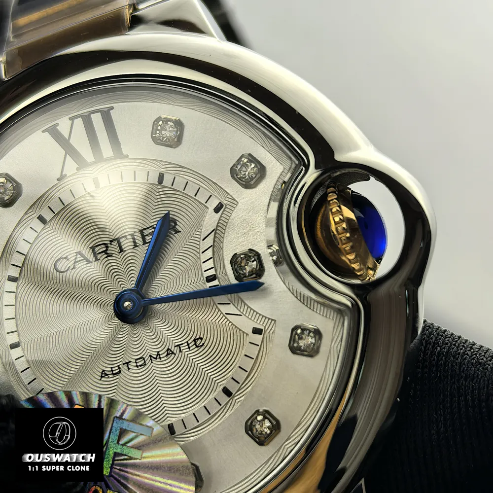 Cartier Ballon Bleu models showcase a range of materials and dial styles, from classic silver guilloché dials to diamond-pavé designs. The Ballon Bleu 33mm model WE902061 exemplifies this elegance in a two-tone palette: an 18K rose gold bezel and fluted crown paired with a polished stainless steel case and bracelet. Its silvered guilloché dial features bold Roman numerals and 11 brilliant-cut diamond hour markers, blending sparkle with refined style. This watch is part of our Cartier watch Super Clone collection, bringing Cartier’s iconic design within reach at an affordable price. Serviced and timed by expert watchmakers, it is offered in excellent condition and ready for everyday wear.