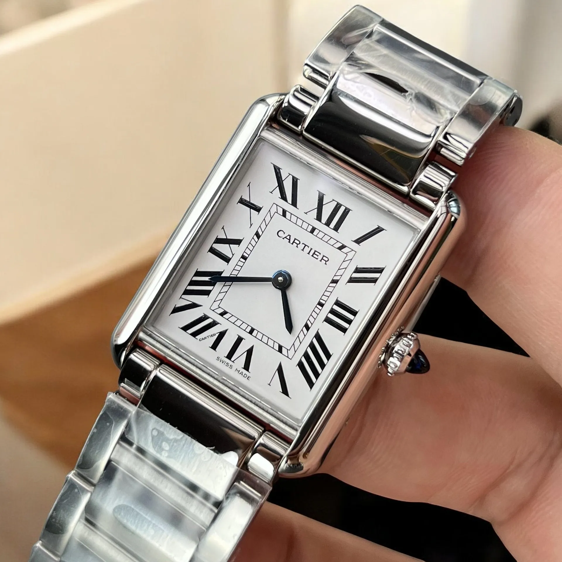 Detailed image focusing on the dial and stainless steel strap of the Cartier Tank Must watch dupe WSTA0052