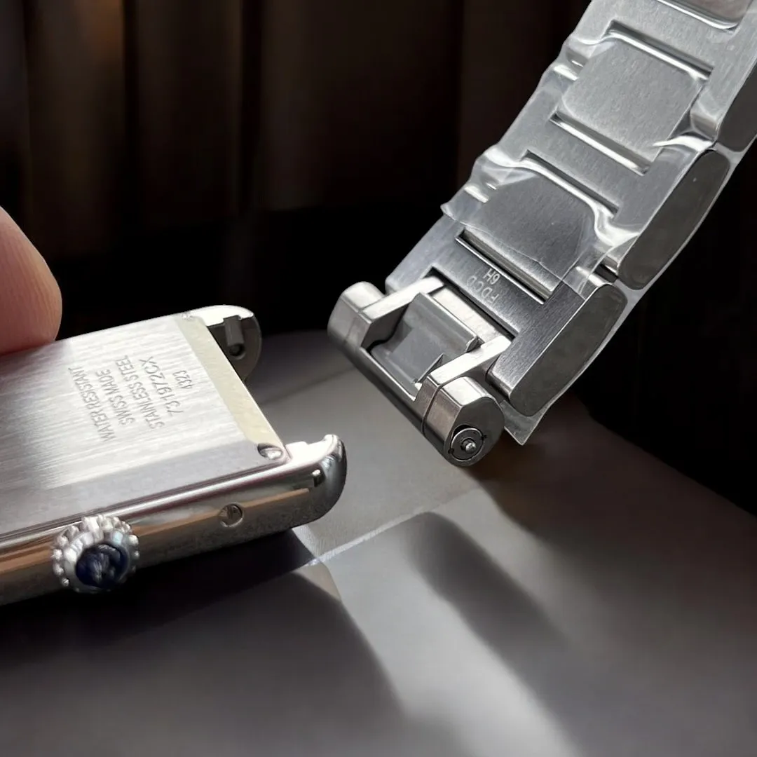 This 33.7×25.5×6.6mm replica reconstructs Cartier’s 2021 Tank Must design with 0.03mm dimensional accuracy. The rectangular case features vertical satin brushing at 75° angle, replicating the original Geneva workshop finishing technique.
