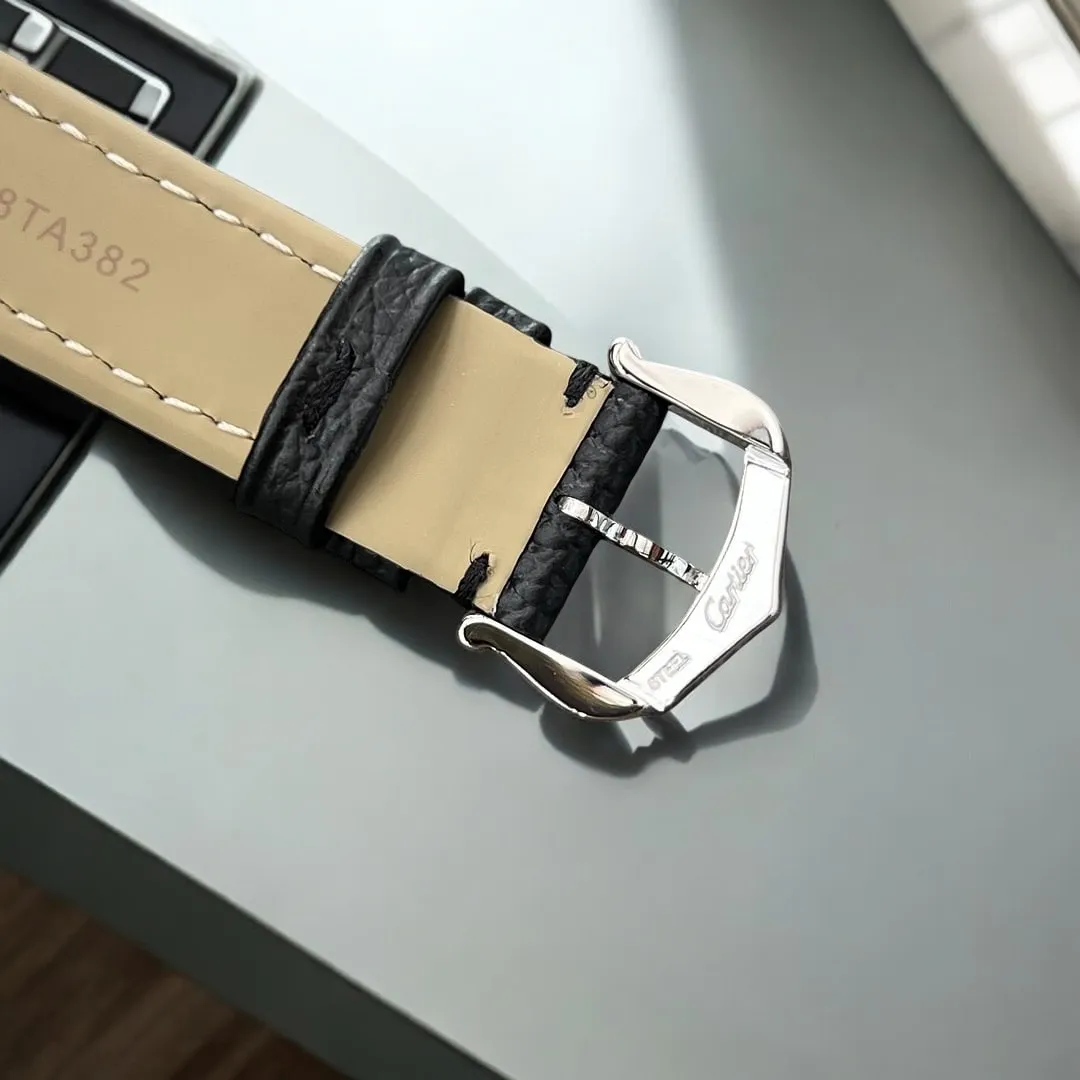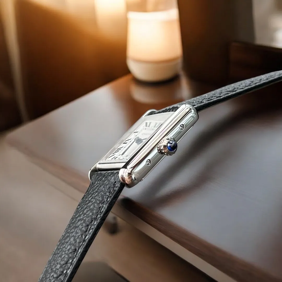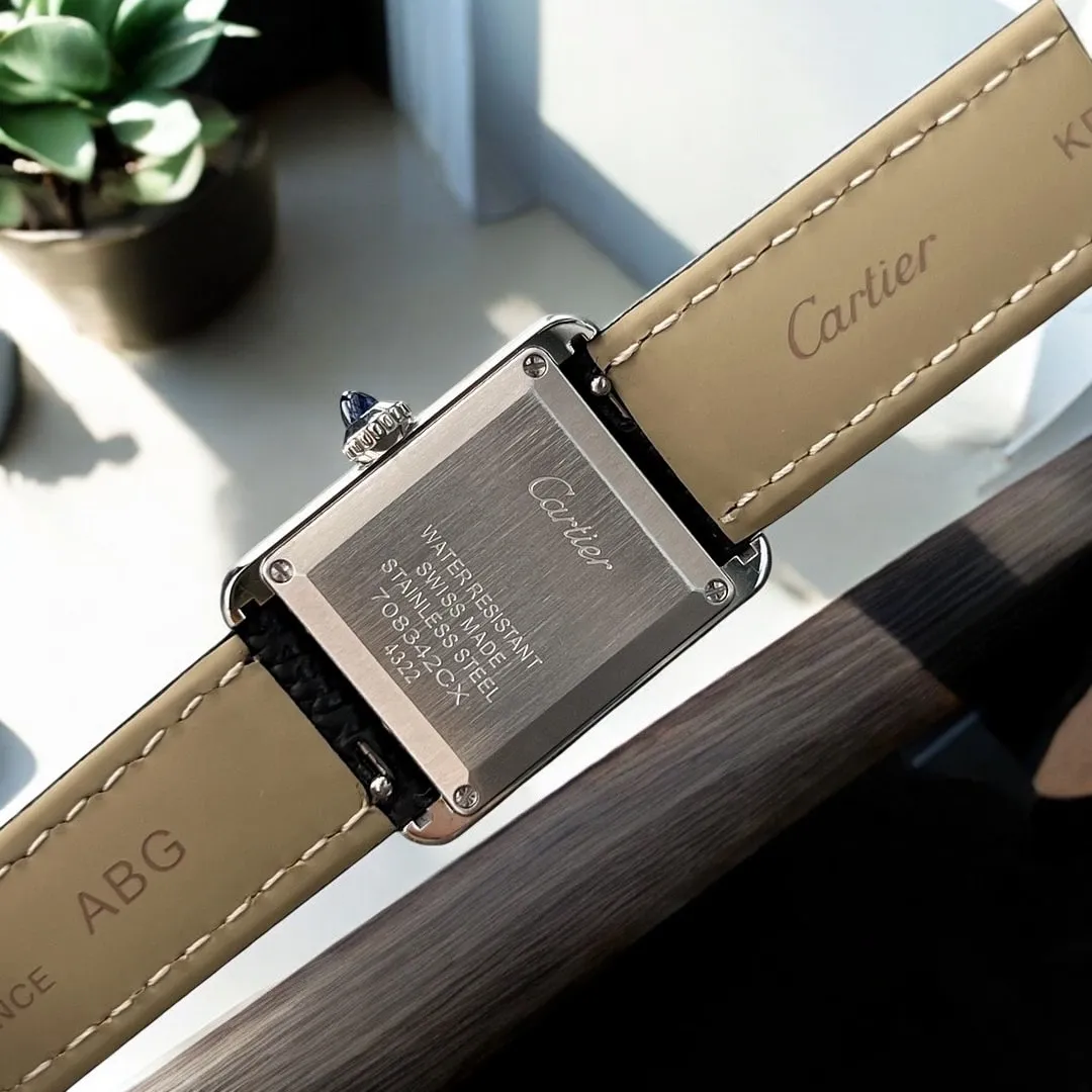Our 1:1 replica captures every iconic detail of the Tank Must Small – from the 29.5 x 22mm rectangular stainless steel case (6.6mm slim profile) to the signature blue synthetic spinel cabochon crown.