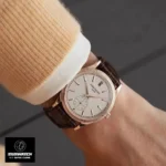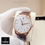 - Silver Vertical Satin Dial: A silvery-grained dial showcases a fine “Paris hobnail” guilloché, punctuated by faceted rose-gold appliqué hour markers and dauphine hour/minute hands for crisp legibility and timeless elegance. The small seconds subdial at 6 o’clock completes the classic layout, while Swiss-grade luminous fill ensures visibility in low light.
