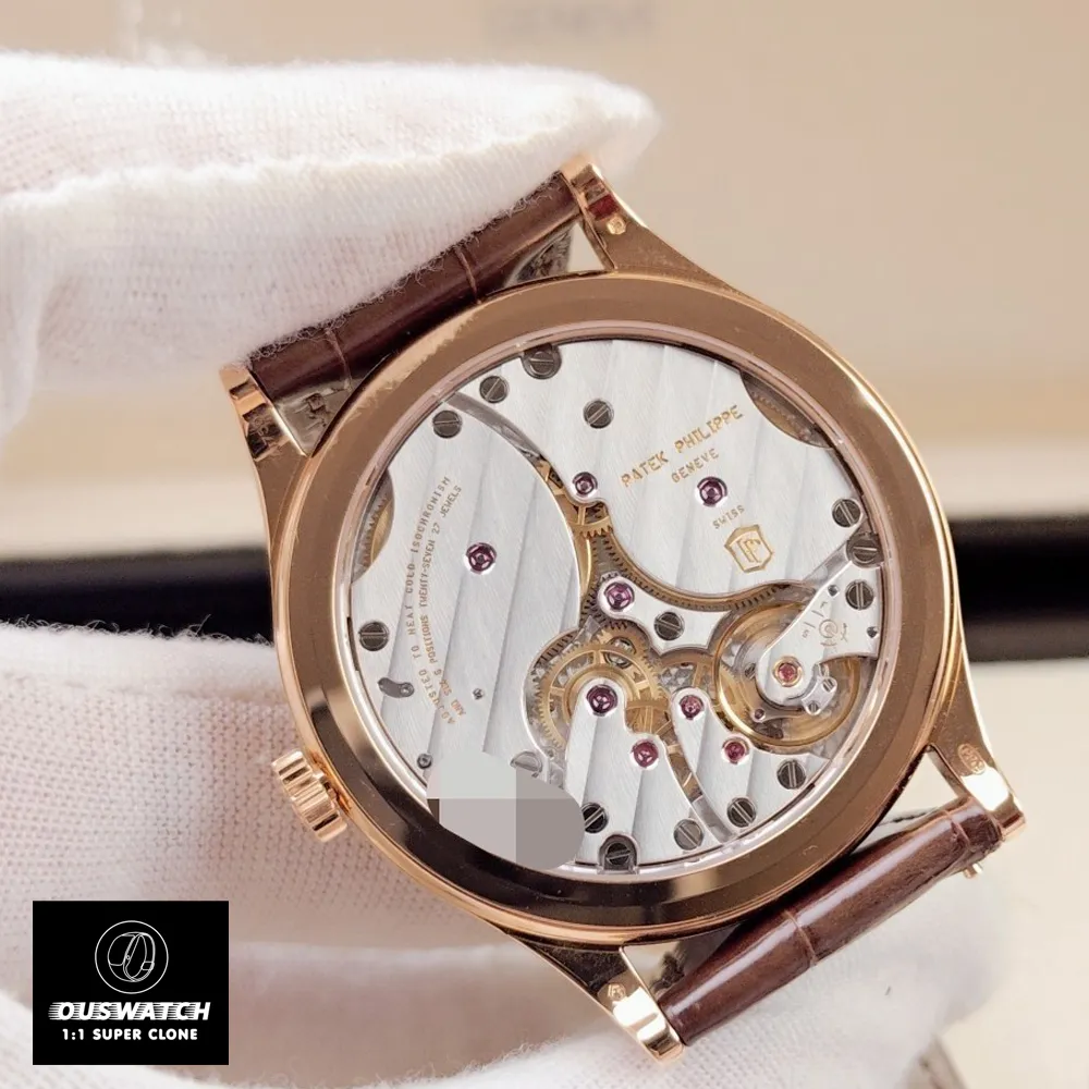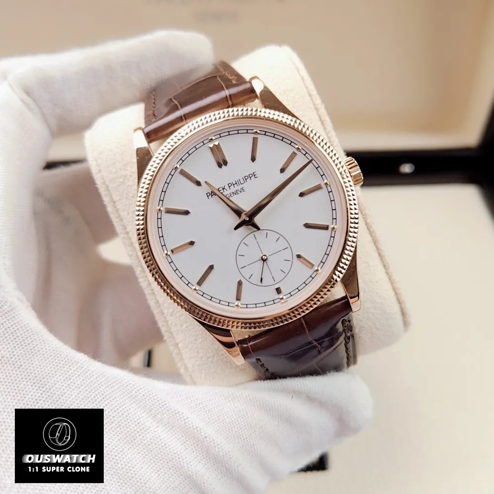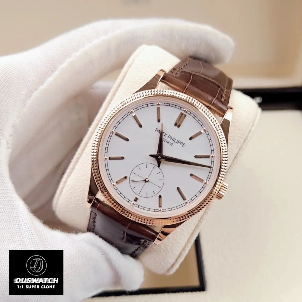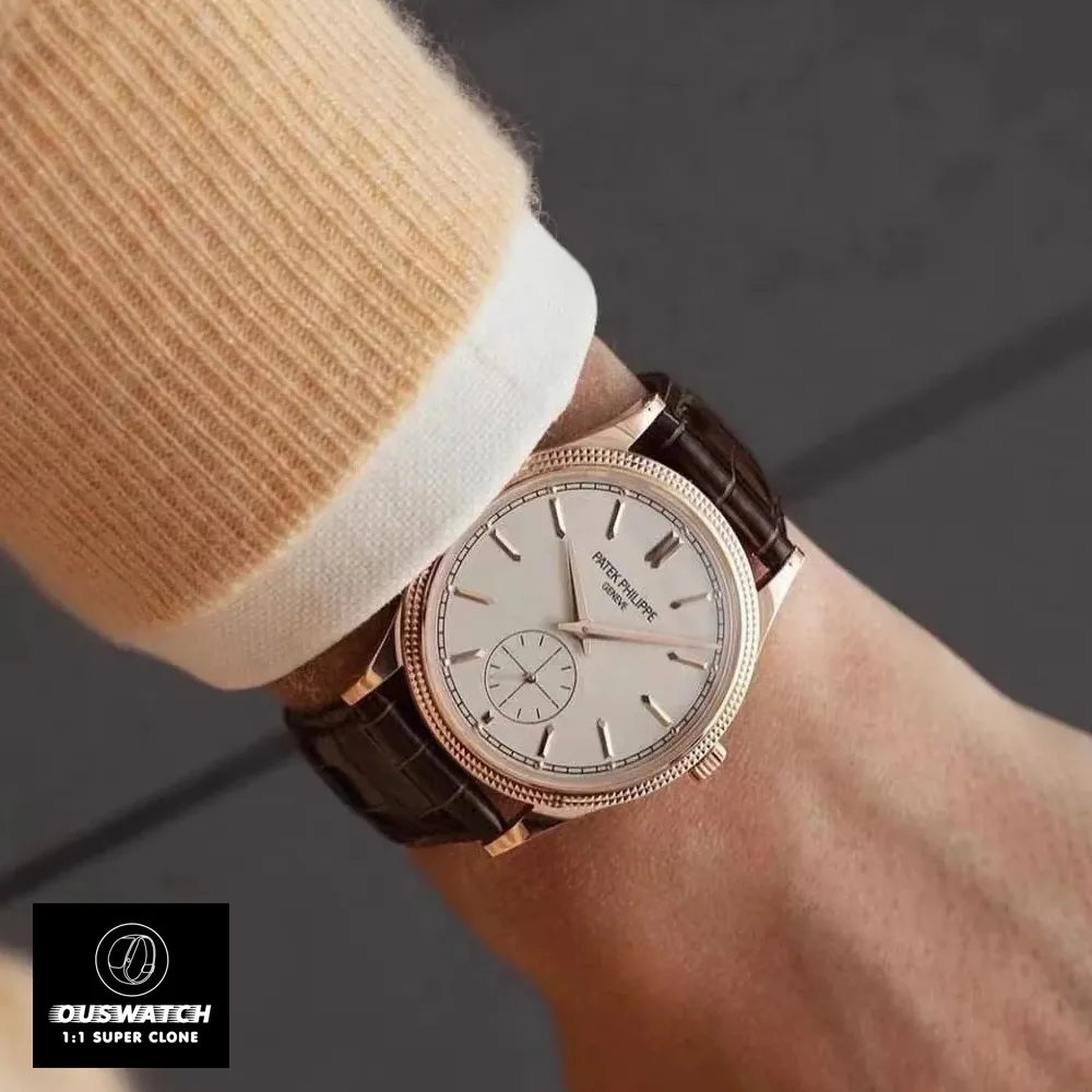 The Patek 6119R-001 Calatrava Rose Gold Silver Dial Super Clone Watch is a high-fidelity replica of Patek Philippe’s iconic Calatrava 6119R, featuring a 39 mm hobnail-patterned rose gold case, silvery grained “Clous de Paris” dial, and manually wound Caliber 30-255 PS with 65 h power reserve.Inspired by the original design, this replica captures every detail of the rose gold classic, from its Clous de Paris hobnail bezel to its silver-grained dial and faceted hour markers.