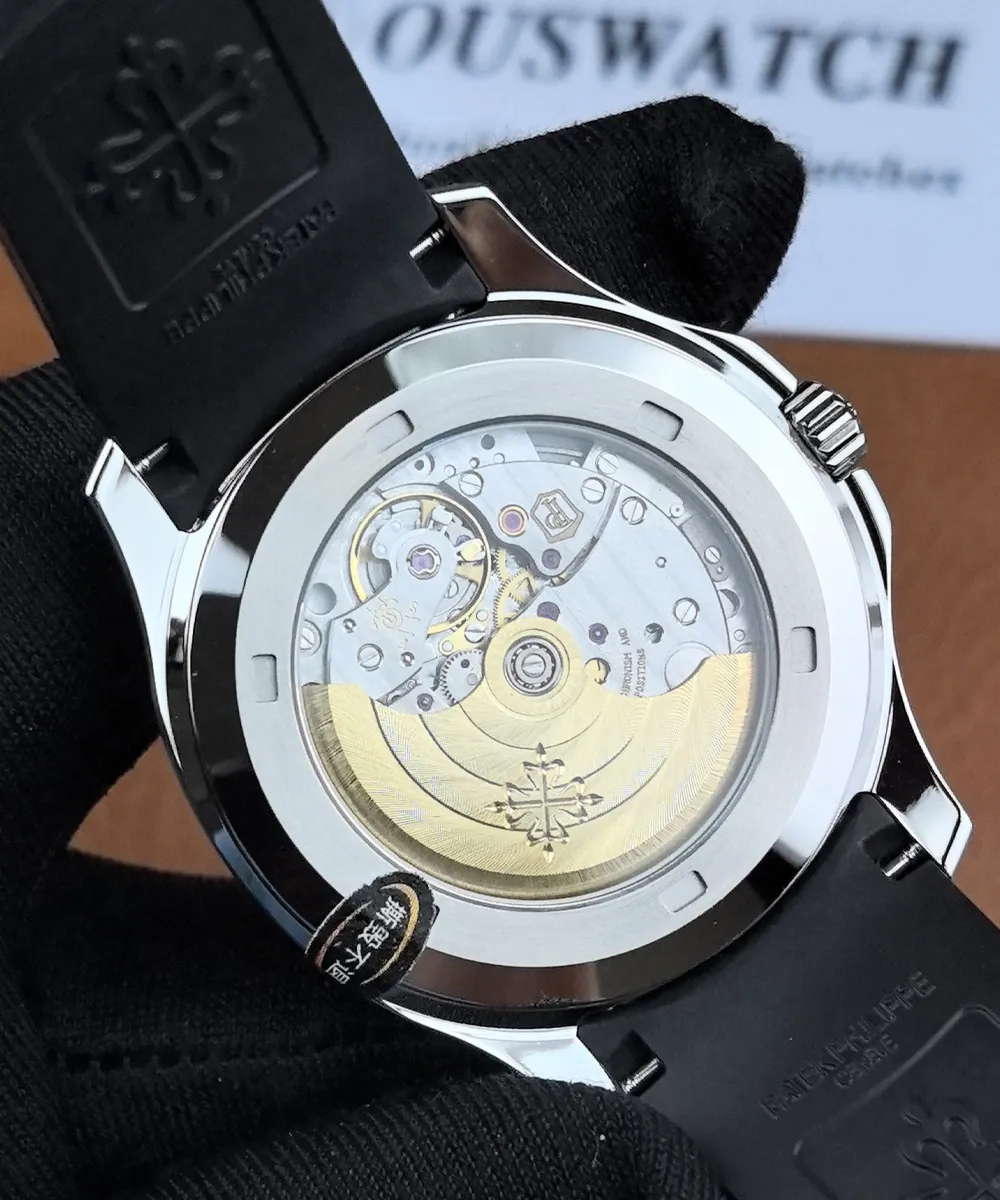 Beyond looks, this Super Clone is built for comfort and everyday durability. The case uses 316L stainless steel, a corrosion-resistant alloy that maintains polish and resists scratches. The sapphire crystals (front and exhibition back) are extremely hard and scratch-resistant. Water resistance is rated modestly (around 10 m), so it’s safe from splashes and rain, but it’s not intended for swimming – keep this in mind as you would with the real Aquanaut (officially 30 m). The black composite rubber strap is not only stylish but also practical: it’s lightweight, hypoallergenic, and has a slight texture that prevents stretching. It hugs the wrist securely with a steel folding clasp. As a result, the watch feels light and balanced on the wrist, suited for both daily wear and active sports. Every aspect of its construction – from the sealed crown to the sturdy strap – reinforces that this is a luxury replica built for longevity.