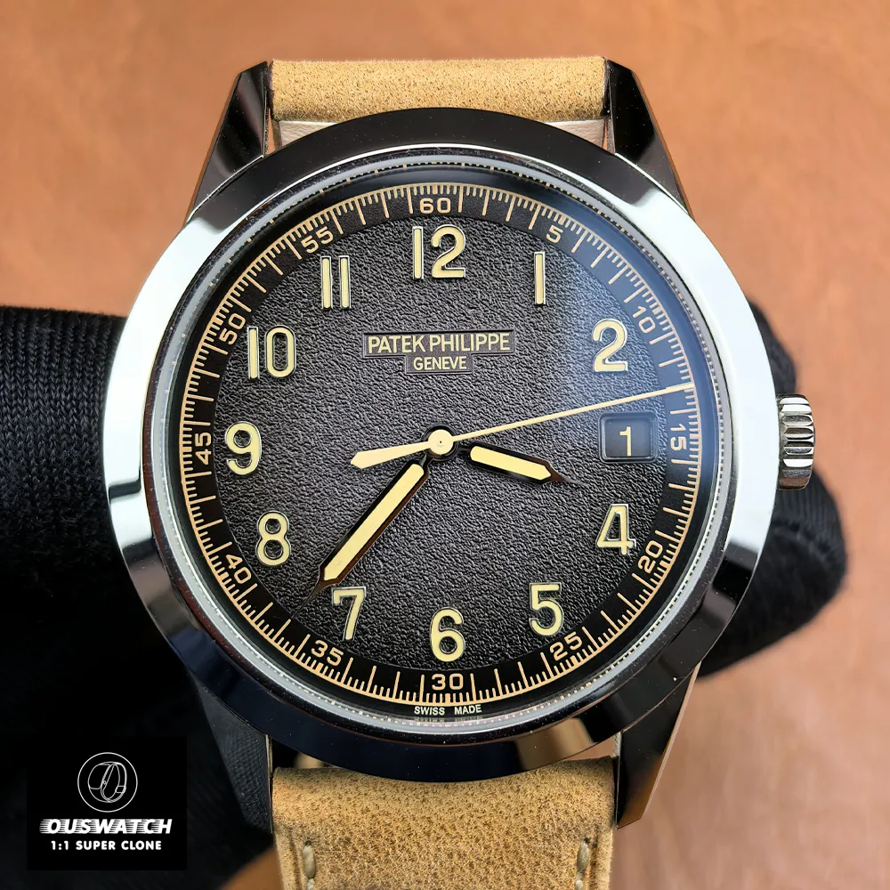 A: The genuine Patek 5226G-001 has an 18K white gold case (40 mm diameter, 8.53 mm thick, water-resistant 30m) with a sapphire crystal. Its dial is textured charcoal-gray with a black-gradient edge. It uses Caliber 26-330 S C (self-winding, date, sweep seconds) with 30 jewels and a 35–45 hour power reserve. The clone matches these specs in appearance and function, though its movement is a high-quality alternative rather than an original Patek caliber. The watch comes with two leather straps (beige nubuck and black calfskin) and a white-gold buckle.