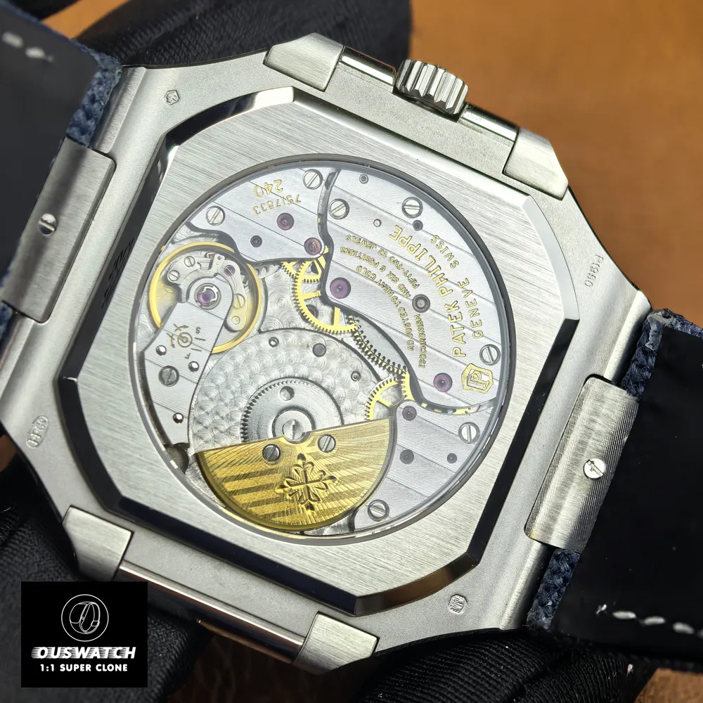 Under the hood the clone uses a Swiss-clone caliber analogous to Patek’s new ultra-thin 240 PS CI J LU movement. This automatic movement has 22K-gold mini-rotor winding and powers all calendar functions. It drives the instantaneous date jump, the hand-adjusted weekday indicator, and the moon-phase display. (The genuine watch required six patents for these mechanisms.) Like the original, the movement delivers a long power reserve – around 48 hours at full wind – so you won’t need daily winding. In short, this clone matches the real Patek’s renowned precision and reliability, even bearing the distinctive finish details of a Patek-grade movement.