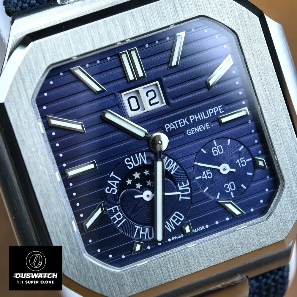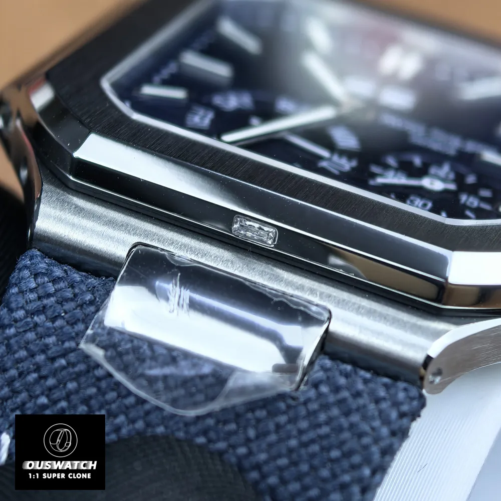 Experience the pinnacle of Patek Philippe craftsmanship with the Patek Philippe Cubitus Blue Face Moon Phase 5822P-001, featured in our Patek Philippe Super Clone collection. This high-grade clone faithfully reproduces the original’s signature elements: a 45 mm polished platinum square case with a baguette-cut diamond at 6 o’clock, and a bold sunburst blue dial with large date, day and moon-phase displays. It even mirrors the genuine watch’s sapphire crystals, Swiss-like 240 PS CI J LU automatic movement, and luminescent white-gold hands and markers. By combining these premium details with top-tier materials, this Patek 5822P-001 delivers authentic style and functionality at an accessible price.