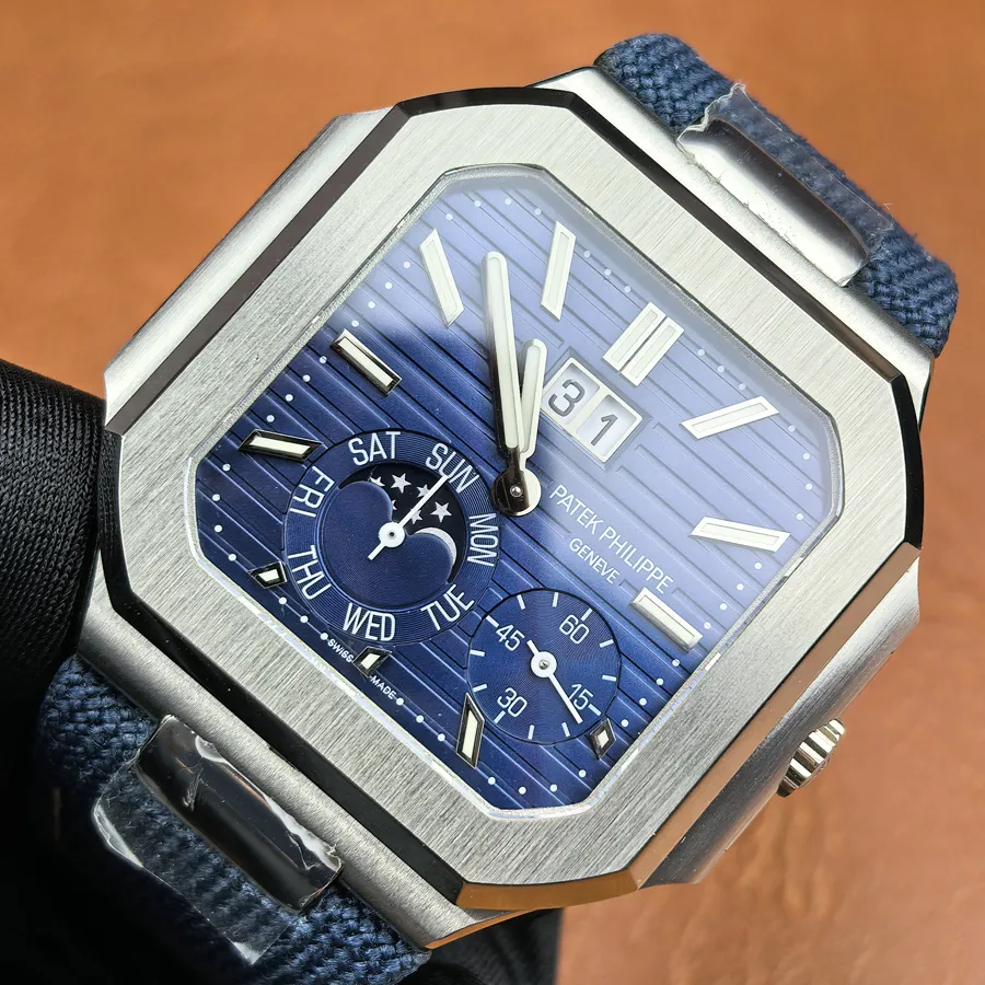 • Dial Work: The dial’s embossed sunburst pattern, applied indices and logo must be precise. Genuine Cubitus markers have perfectly flush Lume; replica makers claim to fill the lume tubes evenly. The printed “Patek Philippe” text on clones is usually very close to the correct font weight, but sometimes lacks the genuine’s deep embossing.