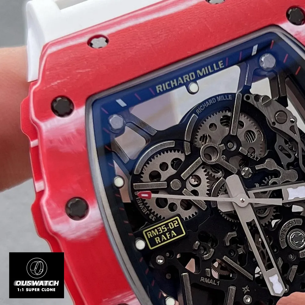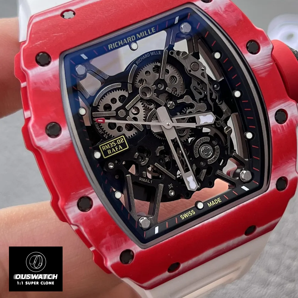 Experience the thrill of a Red Richard Mille at a fraction of the cost. The Red RM 35-02 Super Clone is a high-end Richard Mille replica that mirrors the design, materials, and performance of the genuine Rafael Nadal edition. The original RM 35-02 is engineered for innovation, lightness, and shock-resistance; it uses exotic Quartz-TPT® red composite and Grade-5 titanium in its skeletonized RMAL1 automatic movement. In contrast to the $250,000+ price of a real RM 35-02, our super clone delivers nearly identical specs – 49.94×44.50 mm case, skeleton dial, curved sapphire crystal, rubber strap and 55-hour power reserve – for only a 800 dollars.
