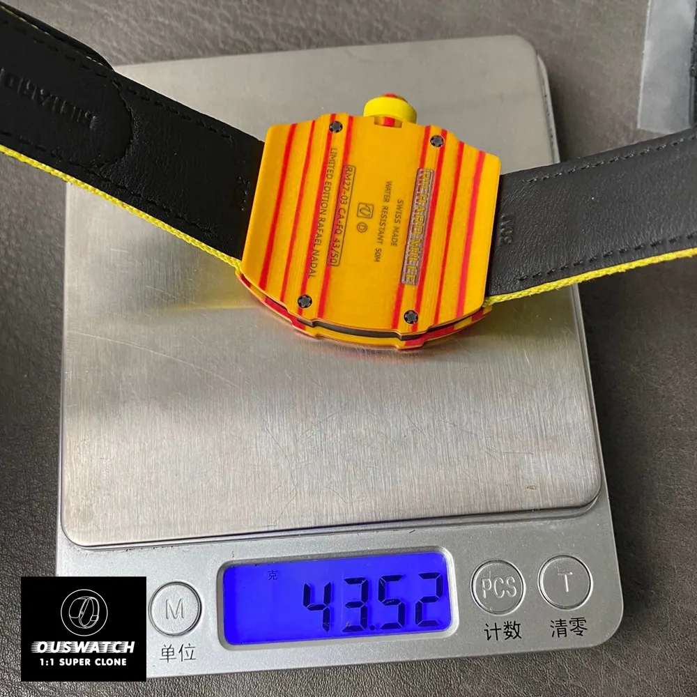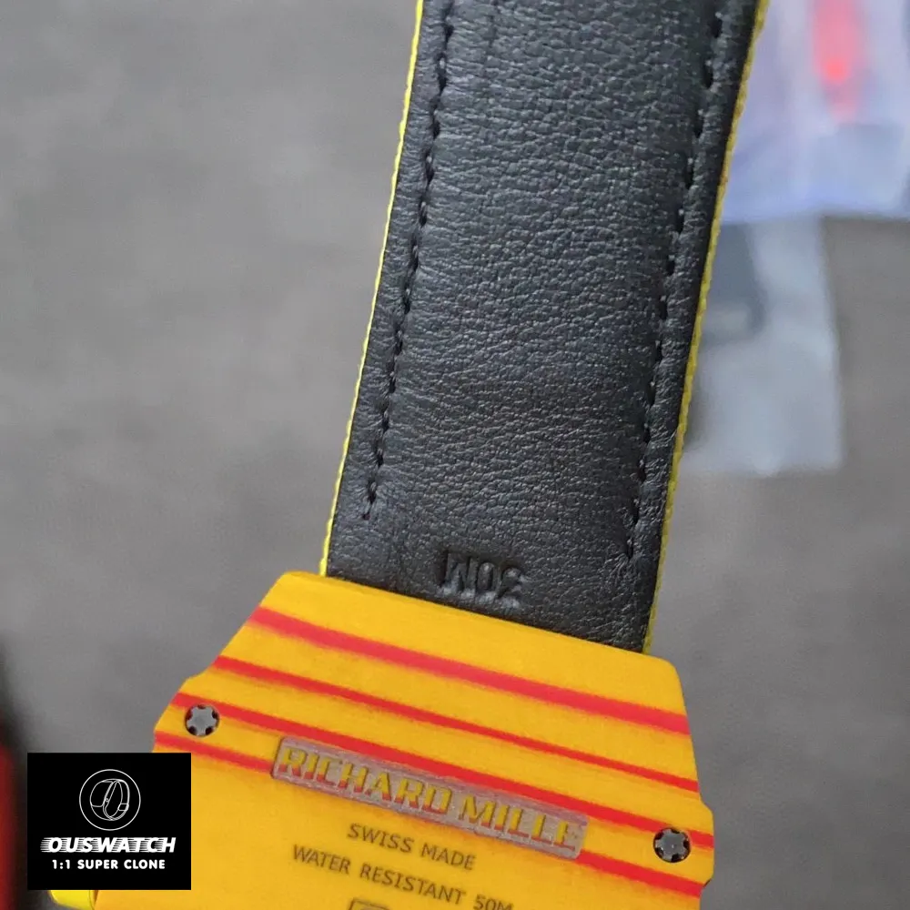 A textile strap (adjustable fabric) secures the 48mm case. This sturdy yet comfortable band is suitable for sports – it won’t slip like leather or rigid metal might during activity. The strap’s clasp and hardware are replicated to match the original. Overall, this yellow/red Richard Mille look is unmistakable: bold, sporty, and high-tech. It feels like a men’s Richard Mille watch made for competition. Despite its size, the advanced composites keep the weight low (under 50g for the case), so the watch floats on the wrist. In short, the RM 27-03 Super Clone offers both the flamboyant aesthetics and the luxury finishing of an authentic Richard Mille Rafael Nadal watch, making it a standout piece for performance or collection.