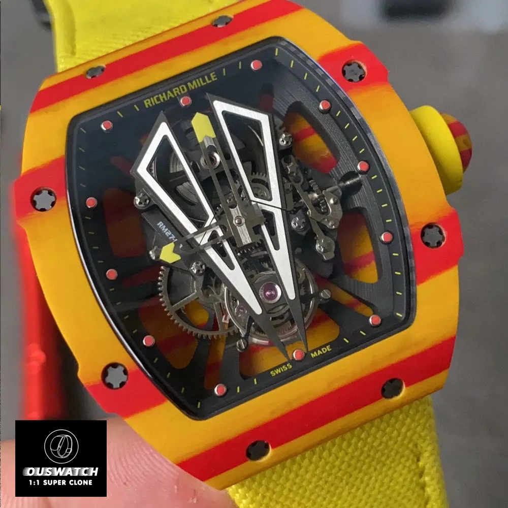 The Richard Mille RM 27-03 Super Clone is a meticulous 1:1 replica of the ultra high-end Rafael Nadal Tourbillon. This men’s Richard Mille watch clone merges cutting-edge engineering with Nadal’s signature style. Its bold red-and-yellow Quartz TPT® case (48mm diameter) and open-worked skeleton dial faithfully reproduce the original’s aggressive look. Powered by a precise manual-winding tourbillon movement with hours and minutes, the RM 27-03 Super Clone offers a true 70-hour power reserve. Engineered for performance use, it combines athletic resilience with luxury finishing – all while using premium materials and Swiss-precision techniques to match the genuine model.
