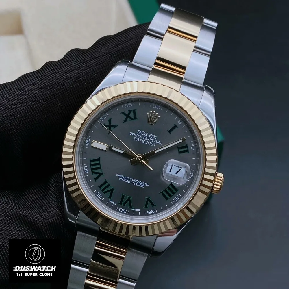| Appearance | Virtually identical look: two-tone Rolesor case, fluted gold bezel, slate Wimbledon dial with green Roman numerals. Slight differences are only noticeable under very close inspection (polish quality, font weight, etc.). | Classic two-tone design: 41mm Oystersteel and 18K yellow gold, gold fluted bezel, slate-grey dial with green Roman numerals (Wimbledon motif). High-polish finishing and crisp dial printing. |