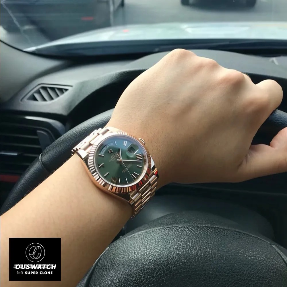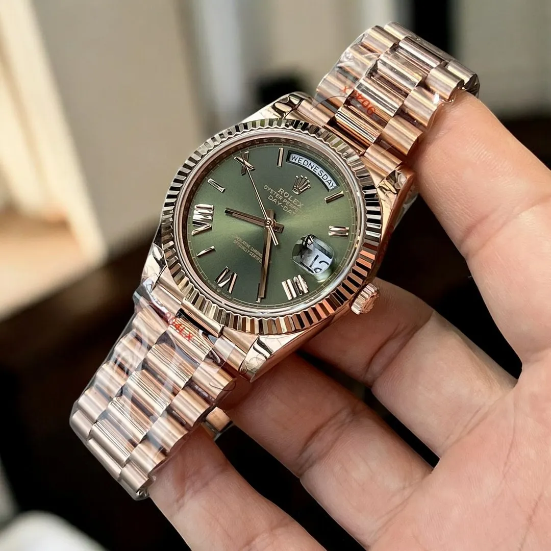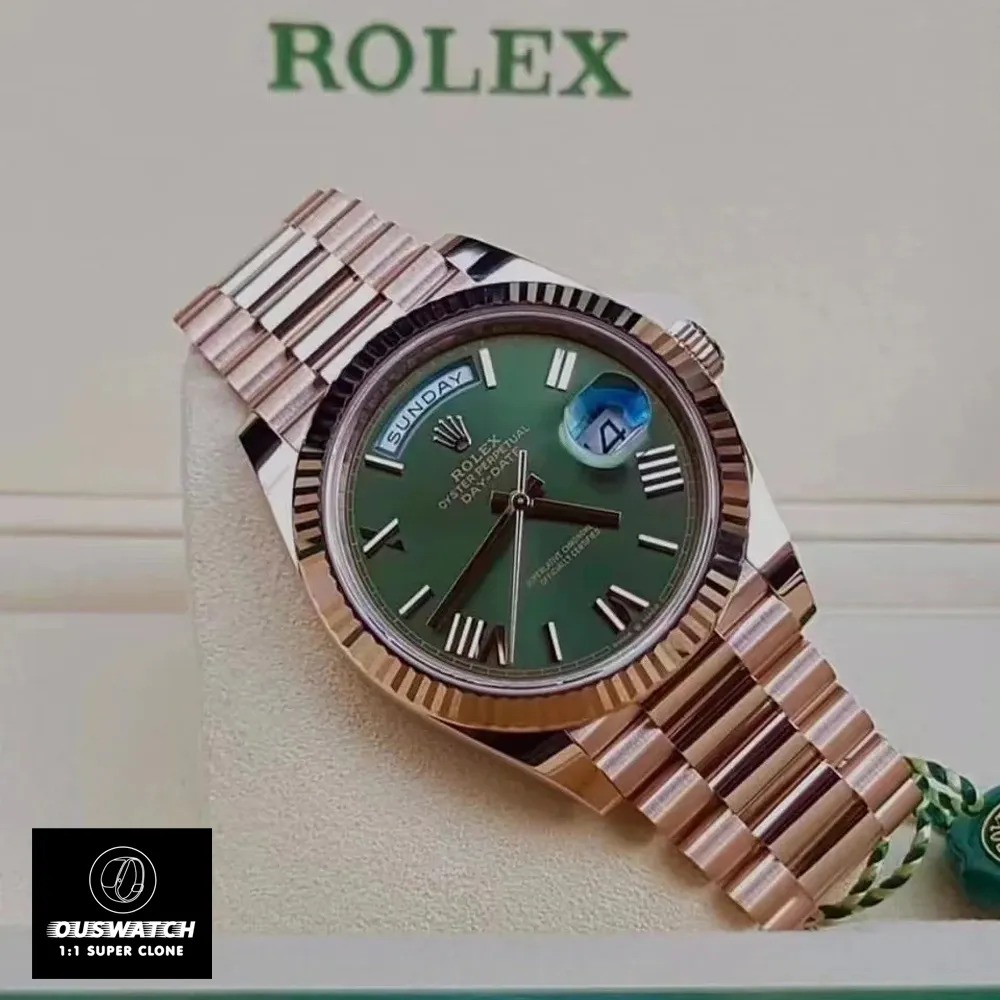 Crafted for world leaders, the Day-Date collection earns its “President” title through seven decades of White House patronage. Our 2025 super clone version faithfully recreates this status symbol in 40mm rose gold (40.00±0.03mm), now featuring an upgraded olive green dial that shimmers like Mediterranean waves.