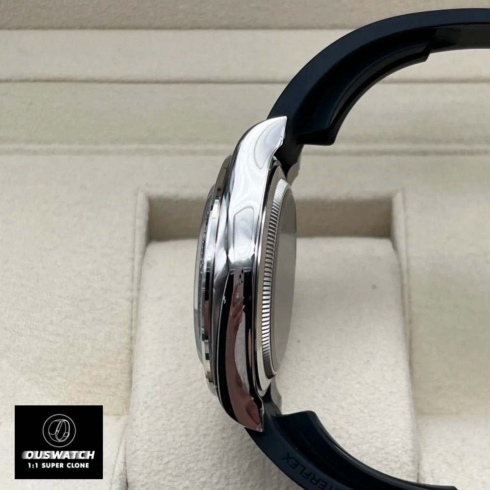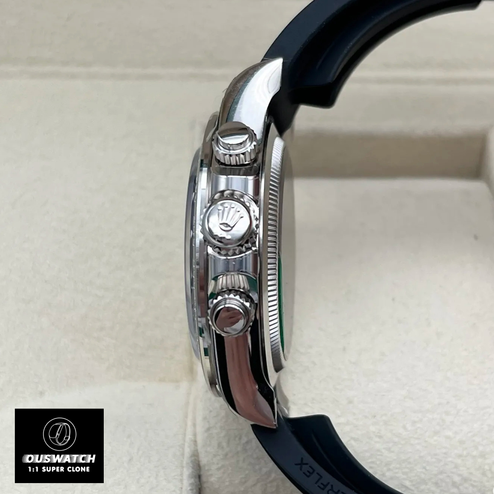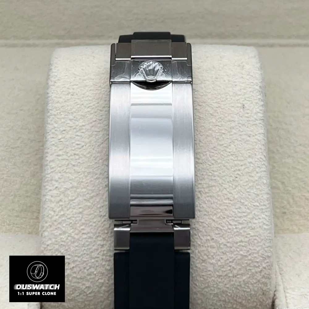 OUSWatch emphasizes premium materials to ensure authenticity. The clone’s case and components are made from 904L stainless steel with 18k white gold plating (especially for the bezel and clasp). The black bezel is high-grade ceramic (as on the genuine) and the crystal is scratch-resistant sapphire. The dial printing (fonts, subdial rings, lume) is precisely matched to Rolex specs. Even small touches – laser-etched rehaut number, engraved crown logo on the winding crown, and crisp luminous markers – are replicated to 1:1 fidelity. According to OUSWatch’s standards, every part is inspected under magnification to mirror the original’s detail. In short, the build quality rivals the factory look.