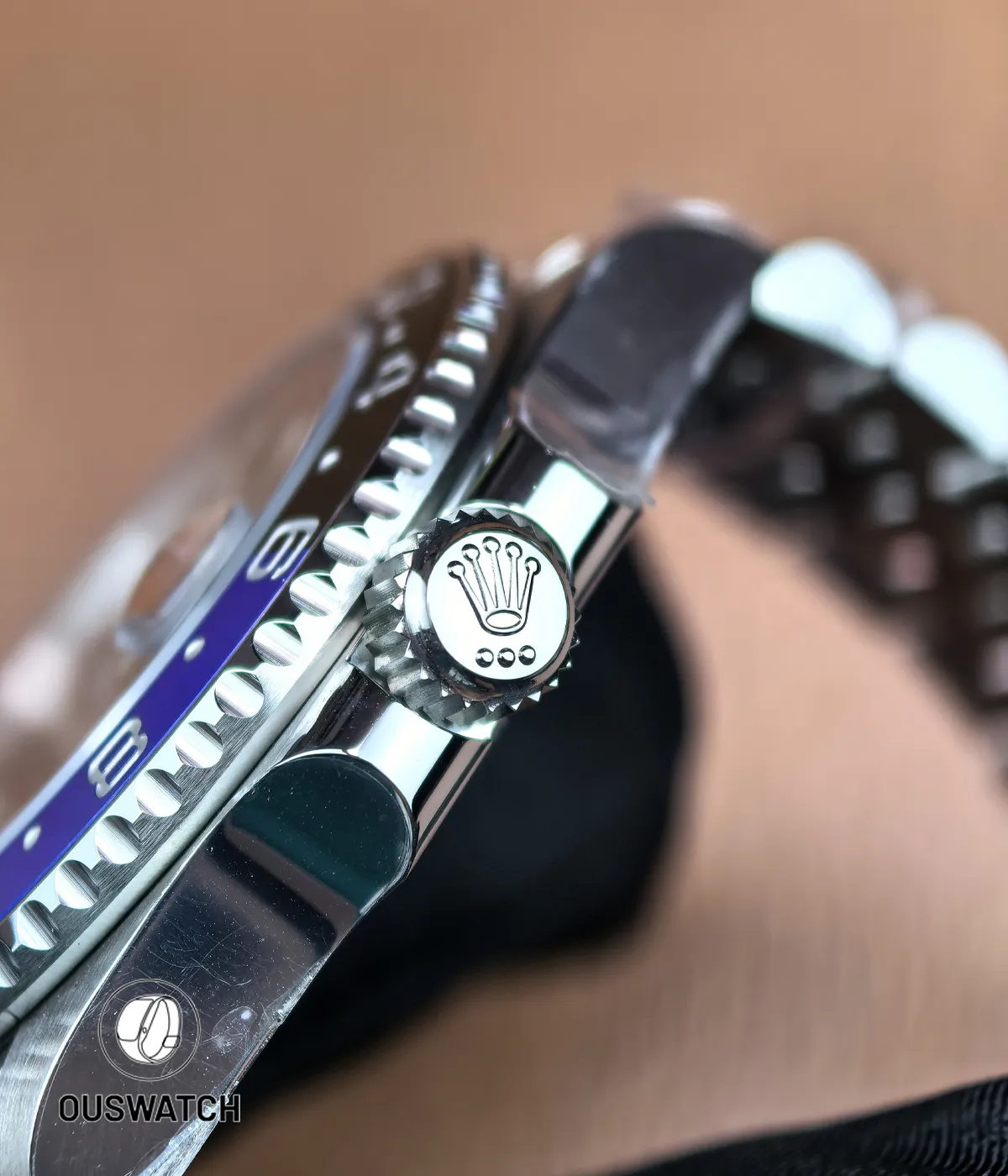 A signature feature is the two-color Cerachrom bezel – half blue and half black – made of ultra-hard ceramic to resist fading. This bidirectional 24-hour bezel lets the wearer track a second time zone easily. The blue portion can denote daytime hours and the black for night, matching the GMT “Batman” and “Batgirl” color scheme. On the wrist, the GMT-Master II “Batman” (Ref. 116710BLNR) demonstrates this bezel clearly. The “Batgirl” version shares this black-and-blue palette, offering the same functionality: an arrow-tipped 24-hour hand circles the dial once per day. Together with the Cyclops date lens, the bezel aids quick reference of dual time – perfect for pilots and travelers.