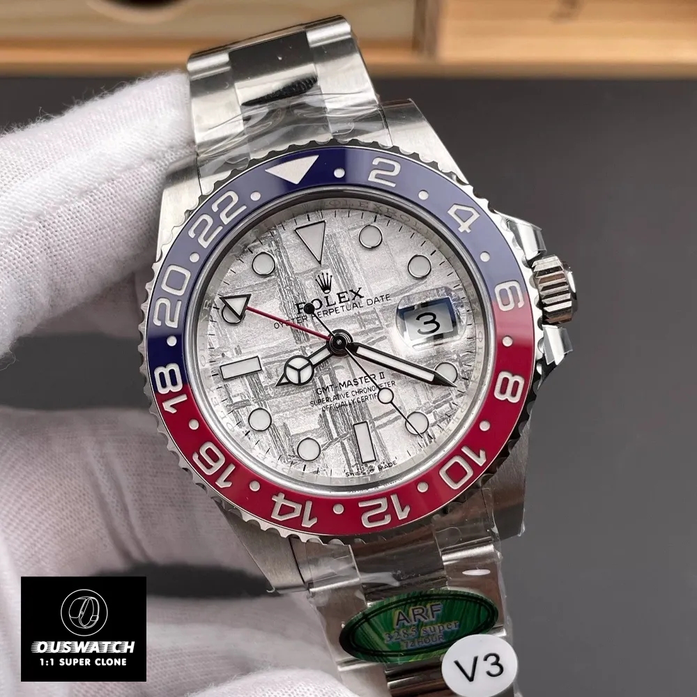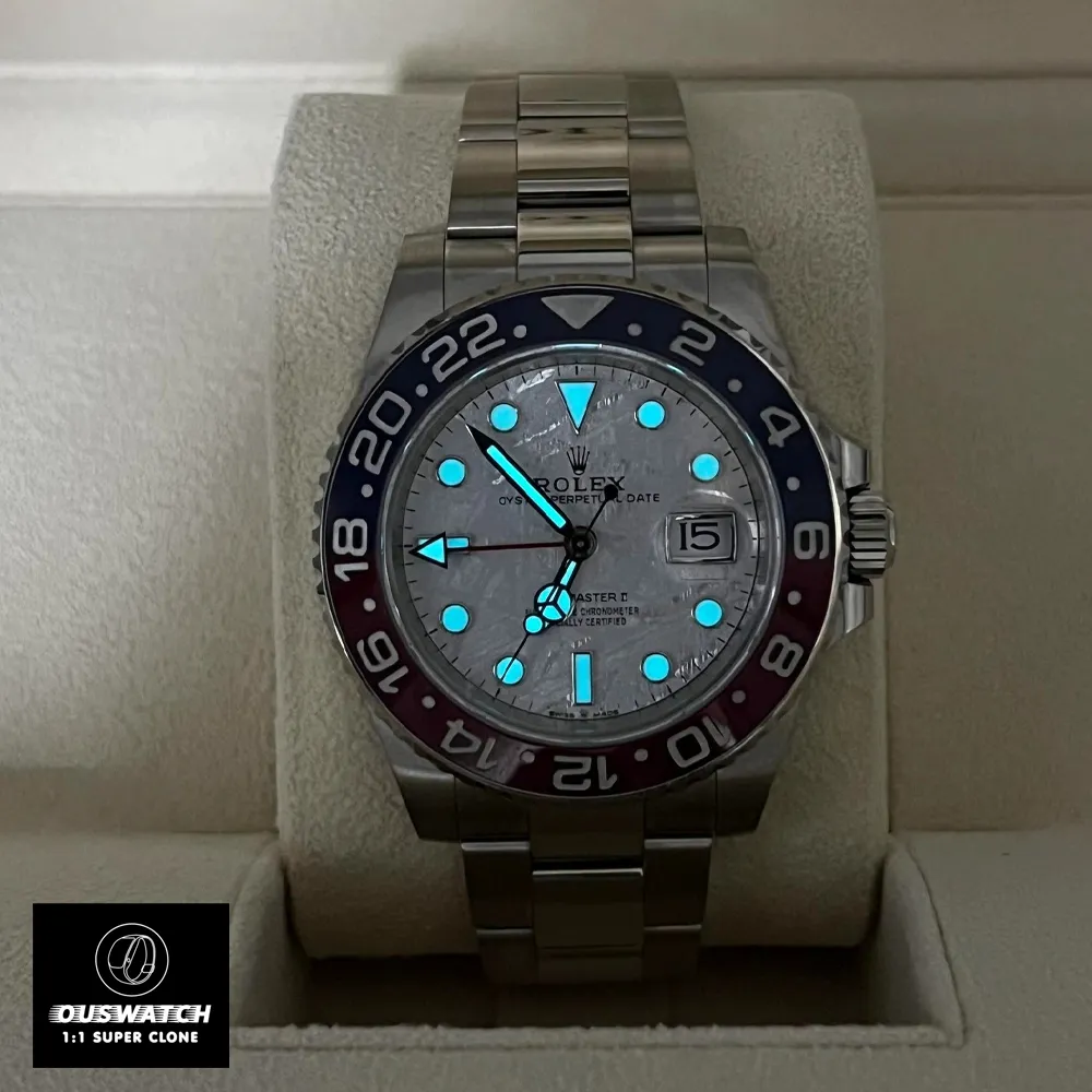This clone meets common needs of luxury watch seekers on a budget. It provides the premium look of a Rolex GMT-Master II — complete with the vivid Pepsi bezel and exotic meteorite dial (a highly coveted feature in horology) — at a fraction of the genuine model’s cost. Searchers of terms like “Rolex GMT Master for sale” or “cheap Rolex watches” will find that this replica delivers the original’s style and GMT functionality without the high price tag, making it an outstanding affordable luxury choice.