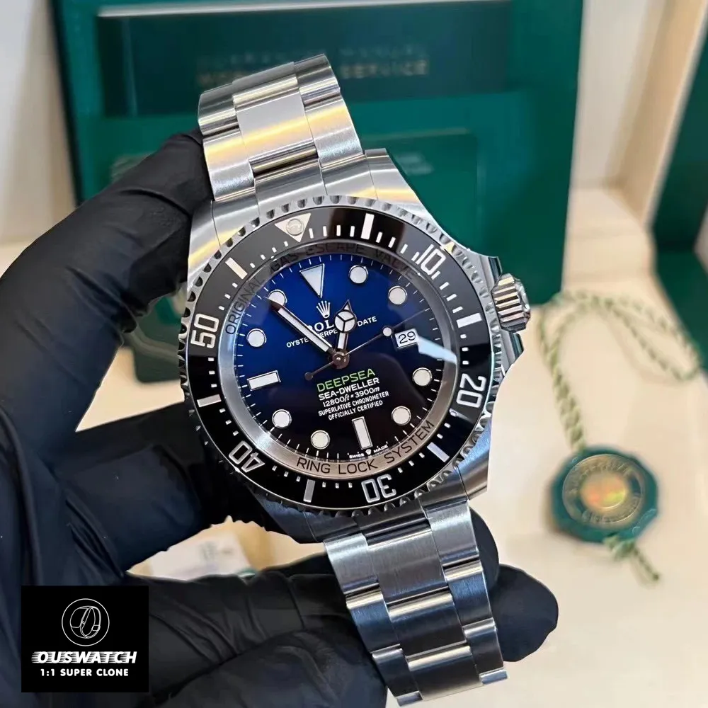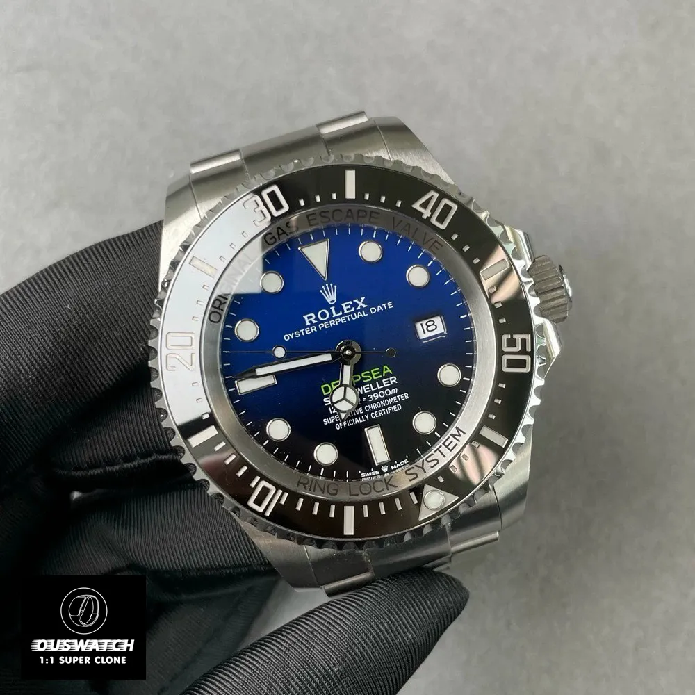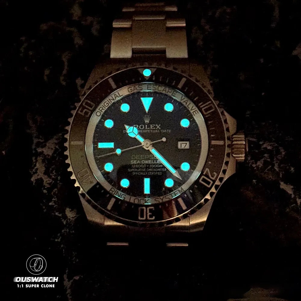 OUSWatch’s super clone of the 136660-0005 is crafted to mirror the original in every detail. From the engraved Rolex logo on the crown to the helium escape valve, every component is precision-engineered to replicate the Deepsea’s legacy. The use of 904L stainless steel and Cerachrom ensures durability, while the luminous elements guarantee visibility in any condition.