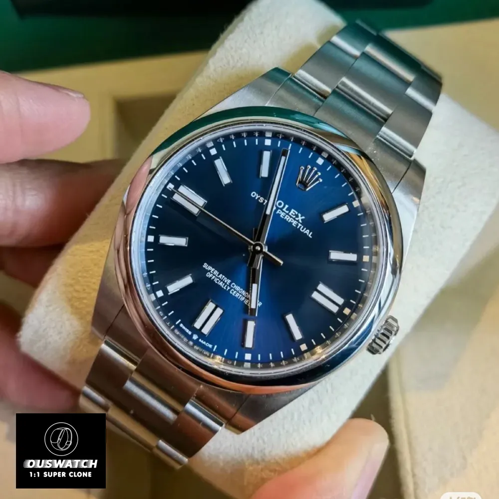 The Rolex Oyster Perpetual Blue Super Clone captures the essence of Swiss watchmaking with its 41mm Oystersteel case and sunburst blue dial. Replicating 98% of the original’s design and mechanics, this timepiece offers everyday luxury for professionals seeking understated elegance.