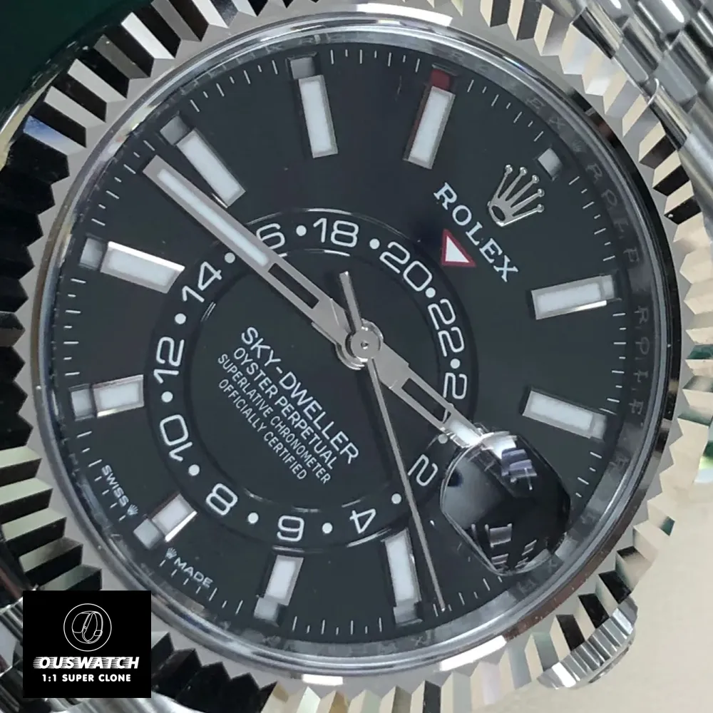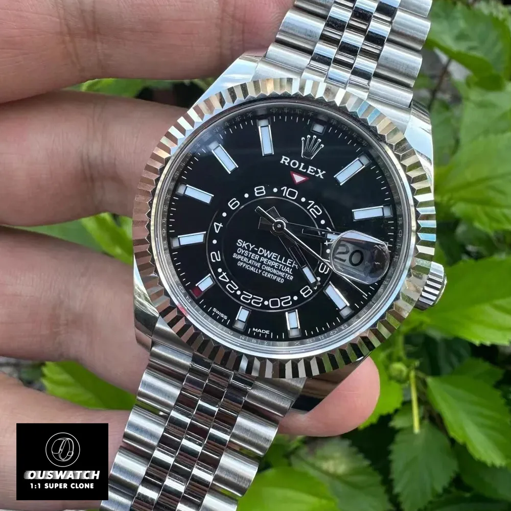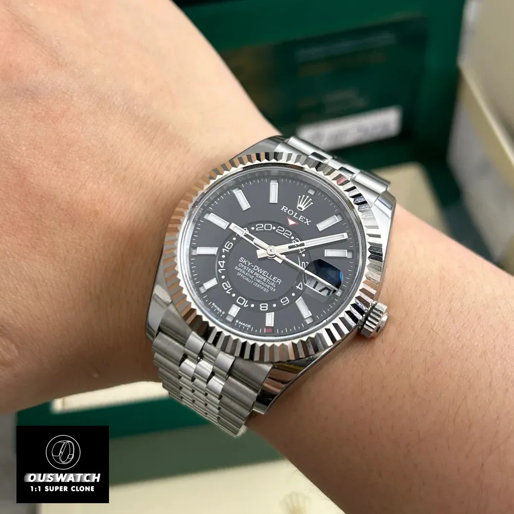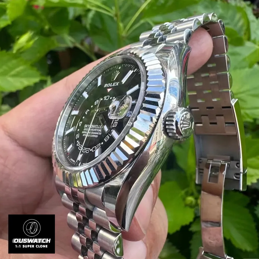 This Rolex Sky Dweller  Super Clone combines Oystersteel robustness with horological sophistication. Designed for frequent travelers and professionals, the 42mm timepiece features a jet-black dial, dual time zones, and an annual calendar – replicating 96% of the original’s functionality at 5% of its retail cost.