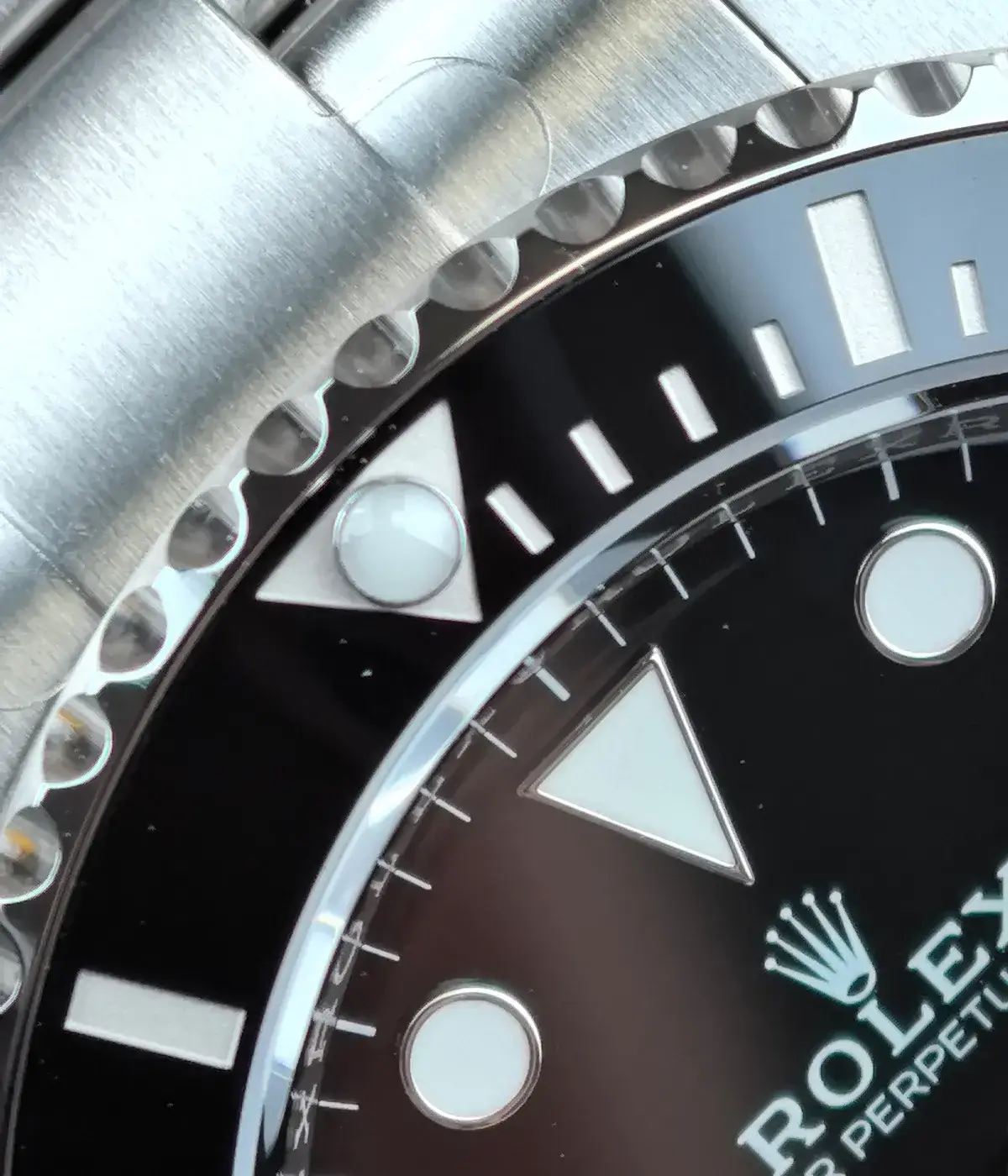 The dial is matte black with applied white-gold hour markers (circles, batons, and inverted triangle at 12) filled with Chromalight-style lume. In darkness it emits the same long-lasting blue glow found on genuine Rolex dive watches. The date window at 3 o’clock has a Cyclops magnifier on the crystal. Our clone’s dial printing – from the “Rolex Oyster Perpetual Date” text to the fine minute track – matches the authentic layout. Enthusiasts note the detail is excellent: “practically impossible to distinguish from a Gen with the naked eye”4 when viewed in person. Every dial element (hands, indices, logo) is aligned and finished to Rolex standards.