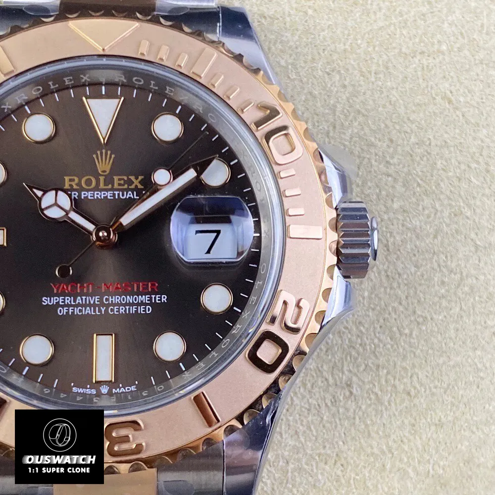 Embrace the perfect blend of form and function with this two-tone Yacht-Master Super Clone. The combination of Everose gold and Oystersteel, the chocolate dial with Chromalight hands, and all the signature Rolex details make it a standout piece. Add this luxurious yet affordable Yacht-Master replica to your collection today and enjoy the nautical elegance of Rolex craftsmanship on your wrist.