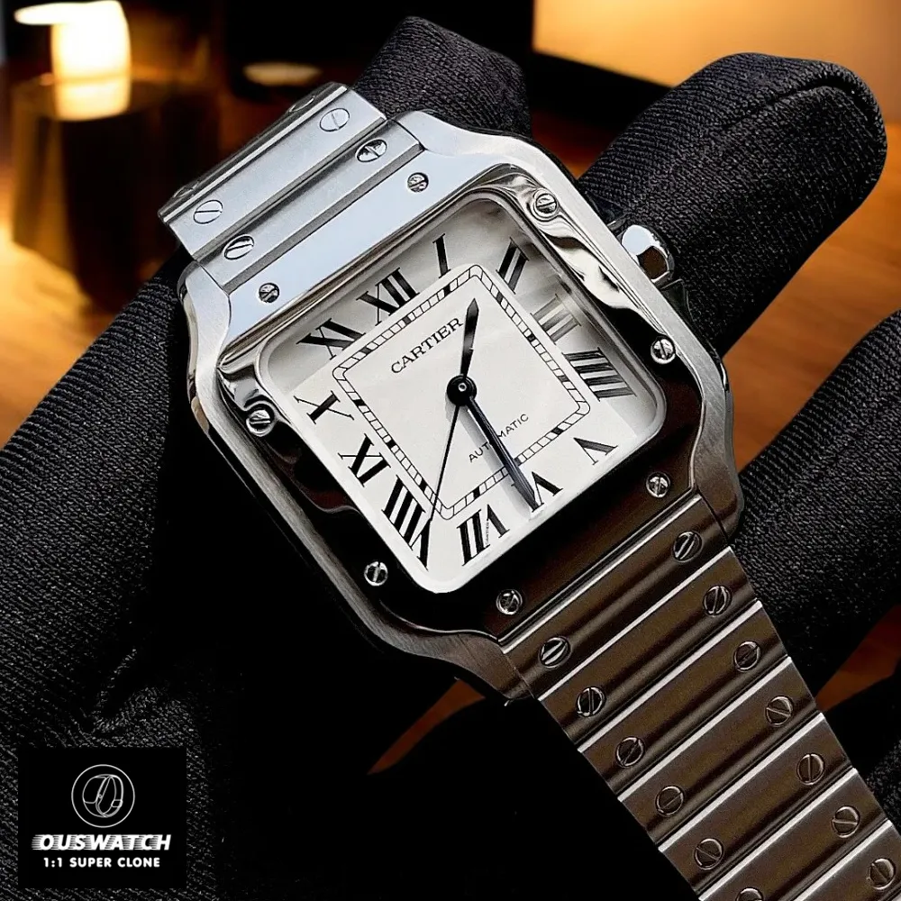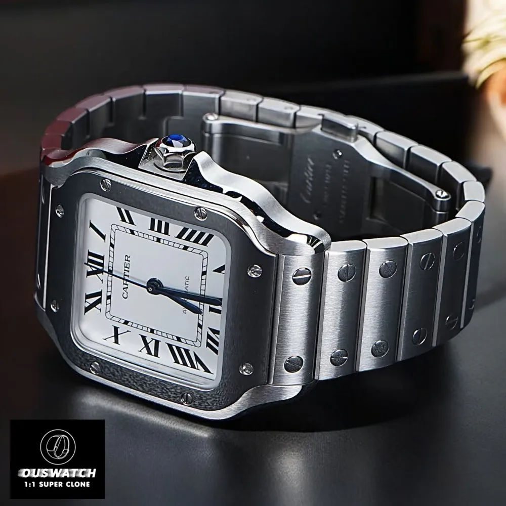 The silvered opaline dial features sloped Roman numerals and a railroad minute track, staying true to Cartier’s 1904 blueprint. At the 7 o’clock position, Cartier’s discreet signature is etched—a hallmark of authenticity replicated flawlessly in this super clone. The steel hands, treated with a luminescent coating, ensure readability in low-light conditions