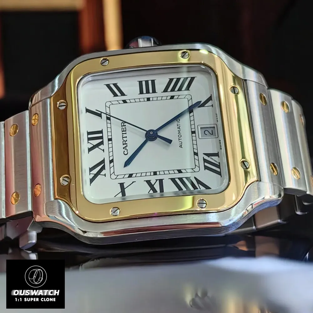 Front view of the Super Clone Cartier Santos W2SA0009 watch, showcasing its iconic design and two-tone elegance.