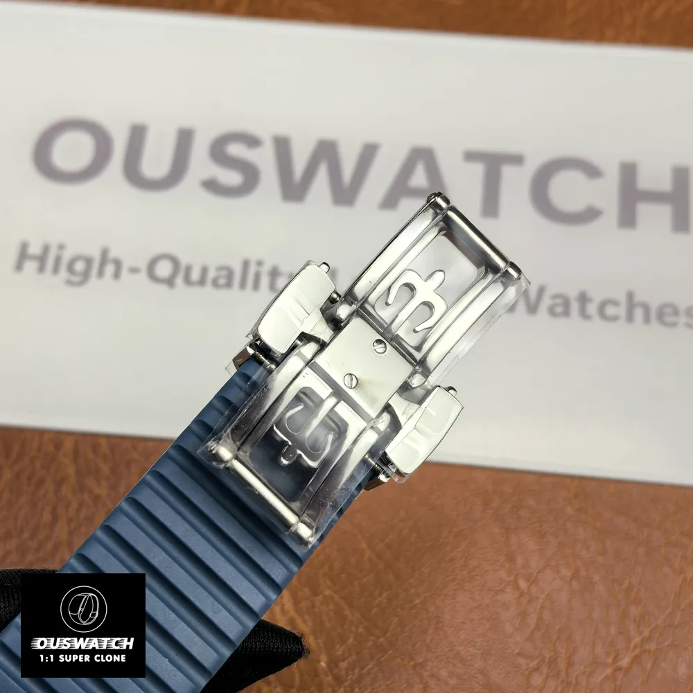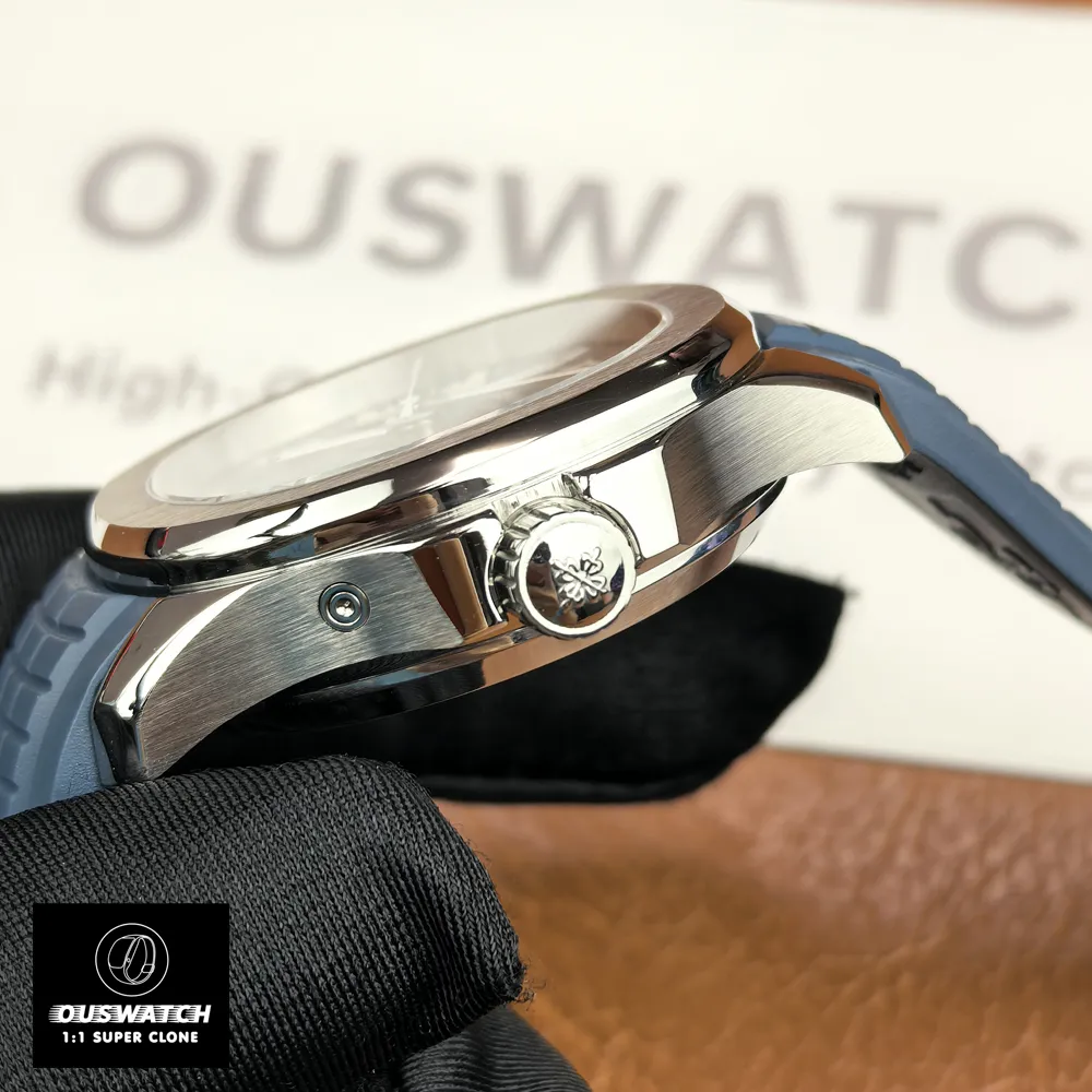 The 2024-gen white gold case is reproduced with 316L steel substrate, featuring 5μm±0.3 nano-grade platinum plating. 40.8mm case diameter replica of original mold data (laser mapping error ≤ 0.05mm). Grey-blue composite strap passes 3,000 bend tests with 18MPa tensile strength.