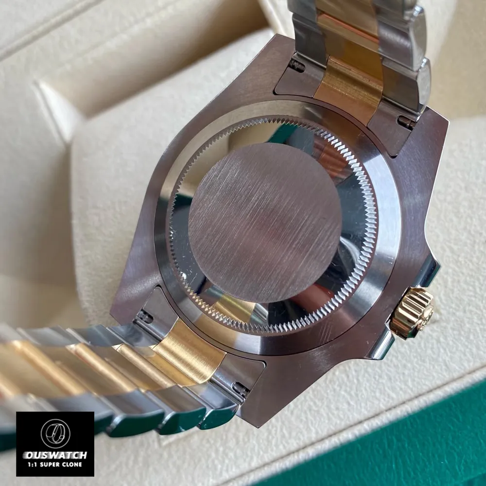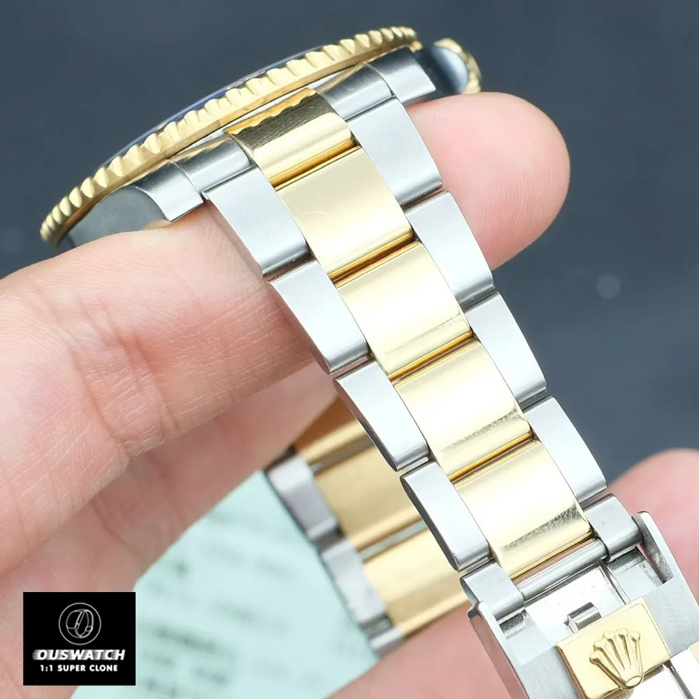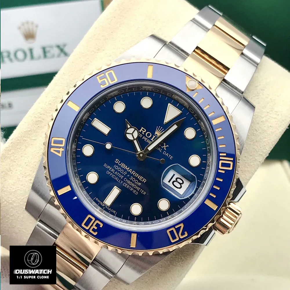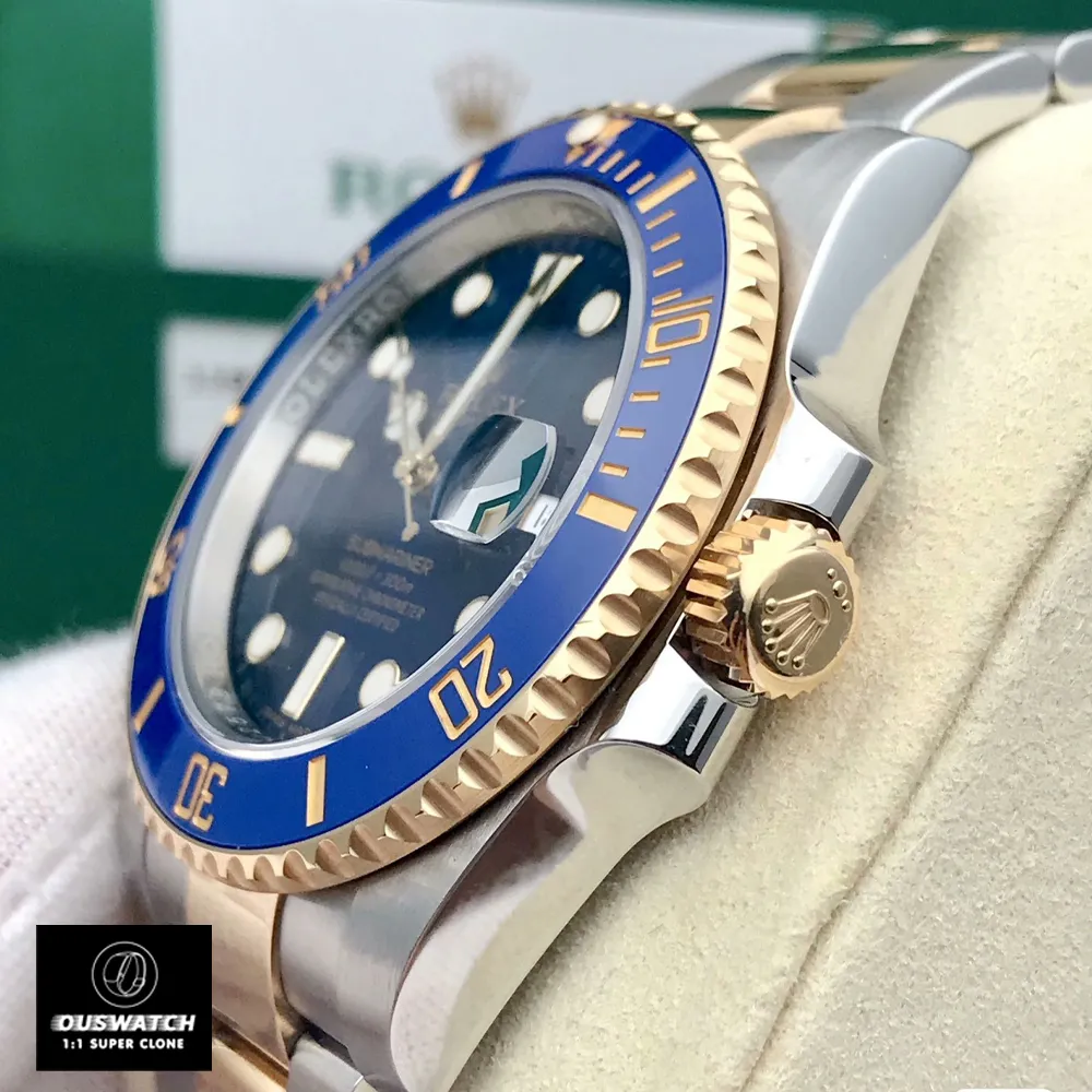Ouswatch presents the 1:1 replicated Rolex Submariner 116613LB – a 40mm stainless steel and 18K gold diver’s watch with striking blue-on-blue aesthetics. This 2015 reference model combines Oystersteel durability with warm gold accents, maintaining the Submariner’s functional elegance.